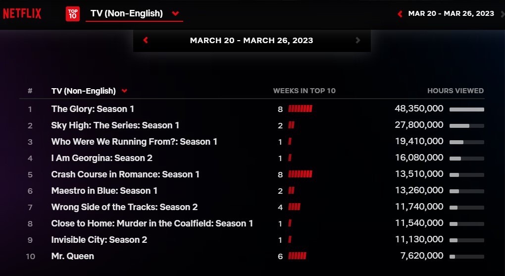 Συγκεκριμένα, όπως θα δείτε και στον πίνακα που δημοσιεύει το Netflix στη σελίδα του, το Maestro in Blue, όπως είναι ο διεθνής τίτλος στην πλατφόρμα, βρίσκεται στο νούμερο έξι της λίστας με 13.260.000 ώρες προβολής κατά τη δεύτερη εβδομάδα κυκλοφορίας του (20-26 Μαρτίου), από τη δέκατη θέση στην οποία βρέθηκε κατά την πρεμιέρα του με 7.300.000 ώρες προβολής.
