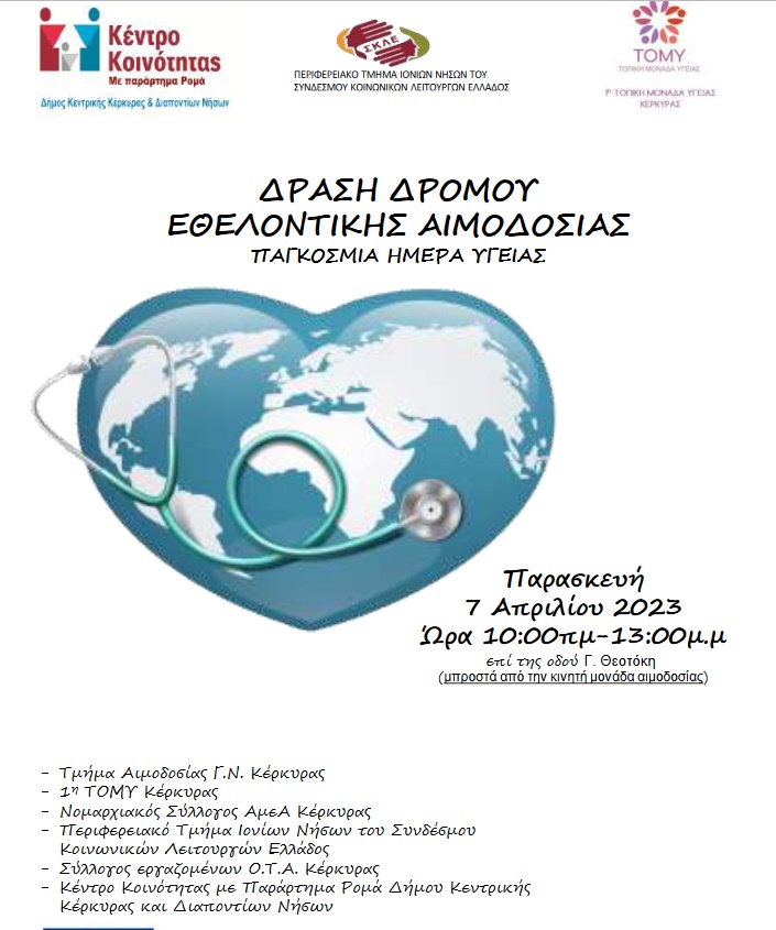 Με αφορμή την Παγκόσμια Ημέρα Υγείας, ο Αντιδήμαρχος Κοινωνικής Πολιτικής του Δήμου Κεντρικής Κέρκυρας και Διαποντίων Νήσων, κ. Ανδρέας Σκούπουρας και τα στελέχη του Κέντρου Κοινότητας με Παράρτημα Ρομά διοργανώνουν δράση δρόμου εθελοντικής αιμοδοσίας σε συνδιοργάνωση με το Τμήμα Αιμοδοσίας του Γ.Ν. Κέρκυρας, την 1η ΤΟ.Μ.Υ Κέρκυρας, το Νομαρχιακό σύλλογο ΑμεΑ Κέρκυρας, το Περιφερειακό Τμήμα Ιονίων Νήσων του Συνδέσμου Κοινωνικών Λειτουργών Ελλάδος και τον Σύλλογο Εργαζομένων Ο.Τ.Α. Κέρκυρας.