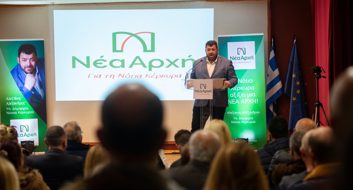 Παρουσία πλήθους δημοτών που γέμισαν την αίθουσα εκδηλώσεων «Λόγου & Τέχνης» στην Λευκίμμη, ο επικεφαλής και υποψήφιος Δήμαρχος Νότιας Κέρκυρας, Αλέξανδρος Αλεξάκης παρουσίασε την Ιδρυτική Διακήρυξη, το λογότυπο και το όνομα του Συνδυασμού «ΝΕΑ ΑΡΧΗ για την Νότια Κέρκυρα».