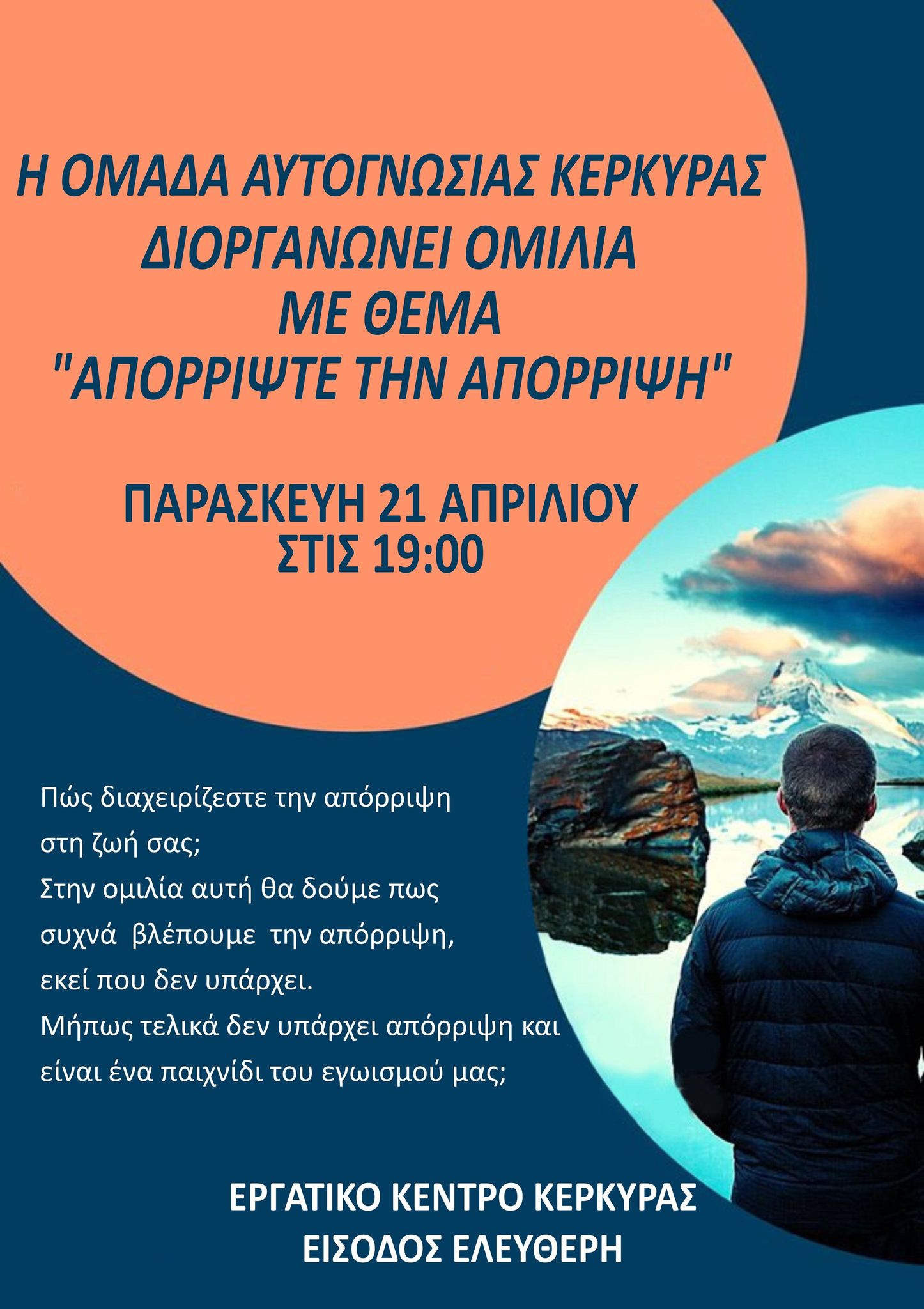 Η Ομάδα Αυτογνωσίας Κέρκυρας διοργανώνει ομιλία με θέμα: ”ΑΠΟΡΡΙΨΤΕ ΤΗΝ ΑΠΟΡΡΙΨΗ”.