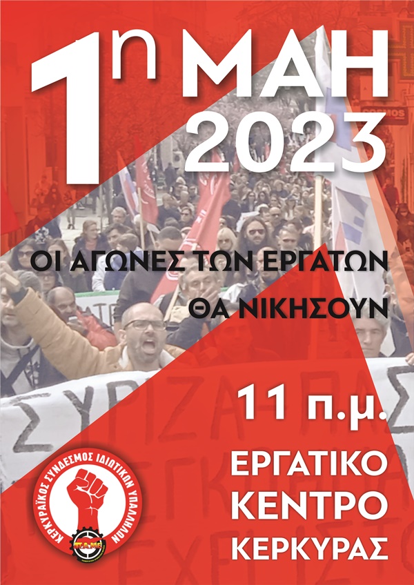 Όλοι οι παραπάνω αγώνες δείχνουν τον δρόμο! Γνωρίζουμε πως το πραγματικό δίλλημα για εμάς είναι αν θα είναι δυνατοί οι αγώνες μας, το κίνημά μας, εμείς ως εργαζόμενοι και αδύναμη η όποια επόμενη αντιλαϊκή κυβέρνηση ή το αντίθετο! Δυναμώνουμε λοιπόν το Σωματείο μας μετατρέποντας την αγανάκτηση σε οργανωμένο αγώνα, βάζοντας μπροστά την ικανοποίηση των δικών μας σύγχρονων αναγκών! Παλεύουμε για τα δικαιώματα και την ζωή μας με νέους αγώνες βαδίζοντας στα χνάρια των αιματηρών αγώνων της τάξης μας μέχρι να πάψει κάθε εκμετάλλευση ανθρώπου από άνθρωπο! Συμμετέχουμε μαζικά στην ΑΠΕΡΙΑΚΗ συγκέντρωση της ΕΡΓΑΤΙΚΗΣ ΠΡΩΤΟΜΑΓΙΑΣ τη Δευτέρα 1η ΜΑΗ στις 11 το πρωί στο Εργατικό Κέντρο Κέρκυρας!