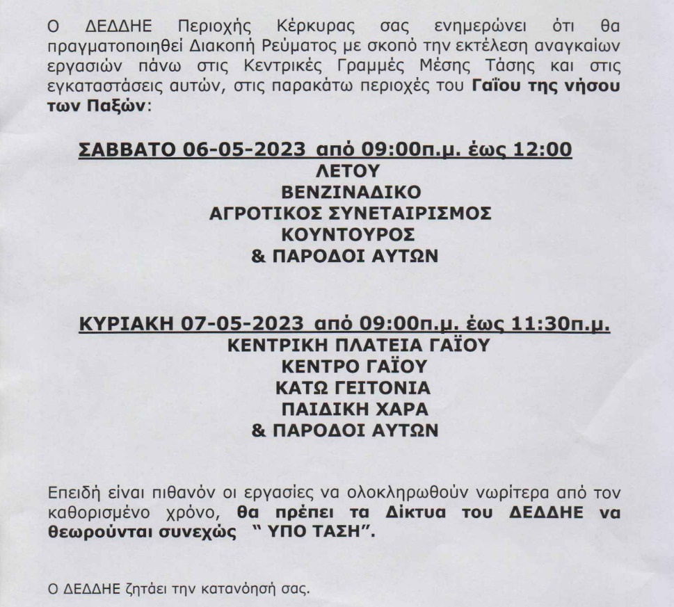 ΚΟΙΝΩΝΙΑΕΛΕΥΘΕΡΟΕΙΔΗΣΕΙΣ Σ/Κ με διακοπές ρεύματος στους Παξούς Διακοπές ρεύματος θα πραγματοποιηθούν το Σαββατοκύριακο στους Παξούς λόγω εργασιών του ΔΕΔΔΗΕ. Last updated: 06/10/2025 00:29 CorfuPress.com Published: 04/05/2023 Share SHARE Διακοπές ρεύματος θα πραγματοποιηθούν το Σαββατοκύριακο στους Παξούς λόγω εργασιών του ΔΕΔΔΗΕ. Διακοπή ρεύματος τη Δευτέρα-Δείτε που Που θα γίνει διακοπή ρεύματος την Τετάρτη Που θα γίνει διακοπή ρεύματος την Τετάρτη Που θα γίνουν προγραμματισμένες διακοπές ρεύματος το διάστημα 23-25 Αυγούστου Έρχεται διακοπή ρεύματος στη Βόρεια Κέρκυρα Share This Article Facebook Whatsapp Whatsapp Email Copy Link Print Previous Article Τι συζήτησε η Υδραίου με την Υπουργό Πολιτισμού (video) Next Article Οι περιοδείες των υποψήφιων βουλευτών του ΣΥΡΙΖΑ τις επόμενες ημέρες Δεν υπάρχουν Σχόλια Δεν υπάρχουν Σχόλια Αφήστε μια απάντηση Ακύρωση απάντησηςΗ ηλ. διεύθυνση σας δεν δημοσιεύεται. Τα υποχρεωτικά πεδία σημειώνονται με *Σχόλιο * Όνομα * Email * Ιστότοπος Αποθήκευσε το όνομά μου, email, και τον ιστότοπο μου σε αυτόν τον πλοηγό για την επόμενη φορά που θα σχολιάσω. ΑναζήτησηΑναζήτησηRecent PostsΌλα τα μάτια στον Θοδωρή, τον καπετάνιο μας! Τη Δευτέρα 22 Σεπτεμβρίου γιορτάζει… Σαν Σήμερα 22/9: Τα σημαντικότερα γεγονότα… Η πρόγνωση του καιρού Έφηβοι Ιονίου: Με περίπατο, συνεχίζουν στο Rising Stars! Recent CommentsΧωρίς σχόλια για εμφάνιση.