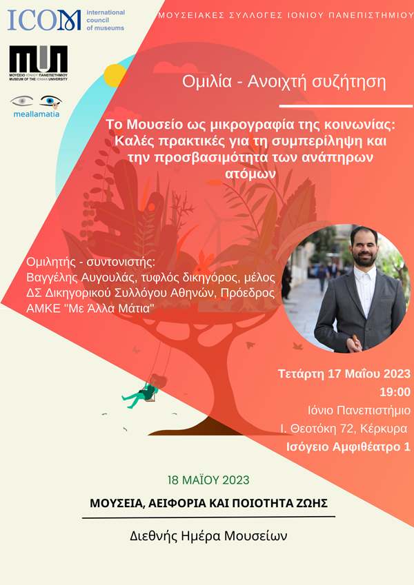 Το Μουσείο του Ιονίου Πανεπιστημίου σας προσκαλεί την Τετάρτη 17 Μαΐου 2023 και ώρα 19:00, στο αμφιθέατρο 1 του Ιονίου Πανεπιστημίου (Ι. Θεοτόκη 72), στην ομιλία του κ. Βαγγέλη Αυγουλα με θέμα «Το Μουσείο ως μικρογραφία της κοινωνίας: Καλές πρακτικές για τη συμπερίληψη και την προσβασιμότητα των ανάπηρων ατόμων».