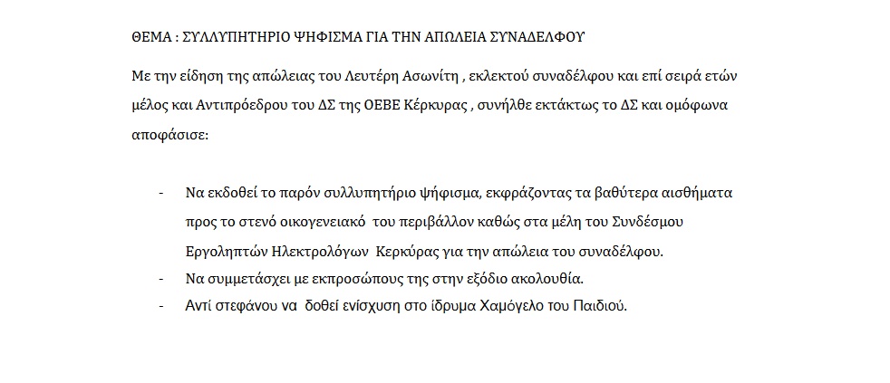 ΚΟΙΝΩΝΙΑΕΛΕΥΘΕΡΟΕΙΔΗΣΕΙΣ Συλλυπητήρια της ΟΕΒΕΚ για το θάνατο του Λ. Ασωνίτη Συλλυπητήριο ψήφισμα της ΟΕΒΕΚ για το θάνατο του επί σειρά ετών αντιπροέδρου και μέλους της Λευτέρη Ασωνίτη. Last updated: 10/05/2023 16:29 CorfuPress.com Published: 10/05/2023 Share SHARE Συλλυπητήριο ψήφισμα της ΟΕΒΕΚ για το θάνατο του επί σειρά ετών αντιπροέδρου και μέλους της Λευτέρη Ασωνίτη. Tην Τρίτη, η εκδίκαση της προσφυγής Καρύδη για τα δημοτικά τέλη… Tην Τρίτη, η εκδίκαση της προσφυγής Καρύδη για τα δημοτικά τέλη… Εμπορικός Σύλλογος και ΟΕΒΕΚ ζητούν αναστολή της αύξησης των δημοτικών τελών ΟΕΒΕΚ: Συλλυπητήρια για το χαμό του Γ. Ρίγγα Συνάντηση εργασίας της ΟΕΒΕΚ με τον Δήμαρχο Share This Article Facebook Whatsapp Whatsapp Email Copy Link Print Previous Article “Το «τουριστικό θαύμα» των νησιών δεν χωράει ένα σπίτι για να μένουν οι εκπαιδευτικοί” Next Article «Νίκη της μαχόμενης εκπαίδευσης η ακύρωση των εξετάσεων PISA» Δεν υπάρχουν Σχόλια Δεν υπάρχουν Σχόλια Αφήστε μια απάντηση Ακύρωση απάντησηςΗ ηλ. διεύθυνση σας δεν δημοσιεύεται. Τα υποχρεωτικά πεδία σημειώνονται με *Σχόλιο * Όνομα * Email * Ιστότοπος Αποθήκευσε το όνομά μου, email, και τον ιστότοπο μου σε αυτόν τον πλοηγό για την επόμενη φορά που θα σχολιάσω. ΑναζήτησηΑναζήτησηRecent PostsΌλα τα μάτια στον Θοδωρή, τον καπετάνιο μας! Τη Δευτέρα 22 Σεπτεμβρίου γιορτάζει… Σαν Σήμερα 22/9: Τα σημαντικότερα γεγονότα… Η πρόγνωση του καιρού Έφηβοι Ιονίου: Με περίπατο, συνεχίζουν στο Rising Stars! Recent CommentsΧωρίς σχόλια για εμφάνιση.