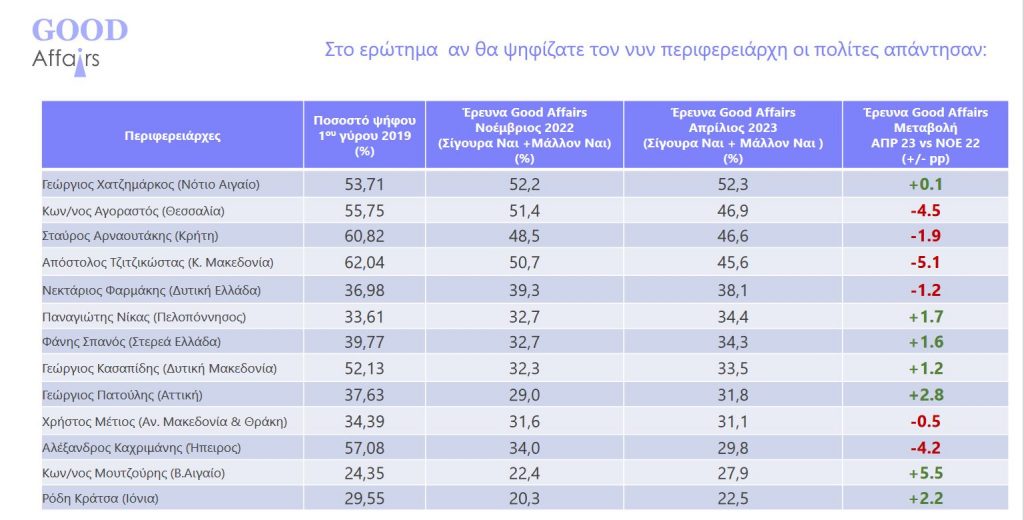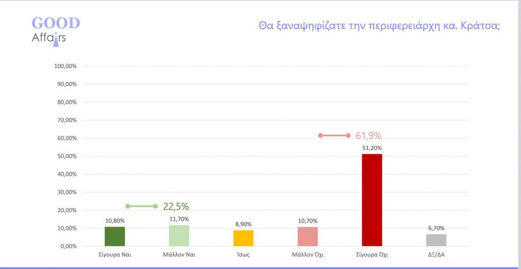 Όπως φαίνεται στον παραπάνω πίνακα, σε σχέση με δημοσκόπηση του Νοεμβρίου, η Ρ. Κράτσα “τσίμπησε” ελάχιστα προς τα πάνω στο ερώτημα για το αν θα την ψήφιζαν εκ νέου για Περιφερειάρχη, με το 22,5% να απαντά θετικά, έναντι 20,3% που είχε λάβει στα τέλη του 2022. Ωστόσο, είναι φανερό ότι η δημοτικότητά της παραμένει πολυ χαμηλά, χαμηλότερη από κάθε άλλο νυν Περιφερειάρχη στη χώρα.