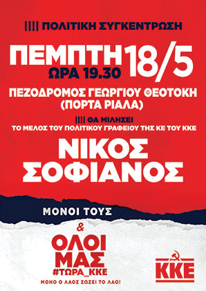 Η Τομεακή Επιτροπή Κέρκυρας του ΚΚΕ απευθύνει πλατύ μαχητικό κάλεσμα συμμετοχής στην μεγάλη προεκλογική συγκέντρωση του Κόμματος στο νησί που θα πραγματοποιηθεί την Πέμπτη 18/5 στις 19:30 στον πεζόδρομο Γεωργίου Θεοτόκη (Πόρτα Ριάλα) με ομιλητή τον Νίκο Σοφιανό μέλος του Πολιτικού Γραφείου της Κεντρικής Επιτροπής του ΚΚΕ.