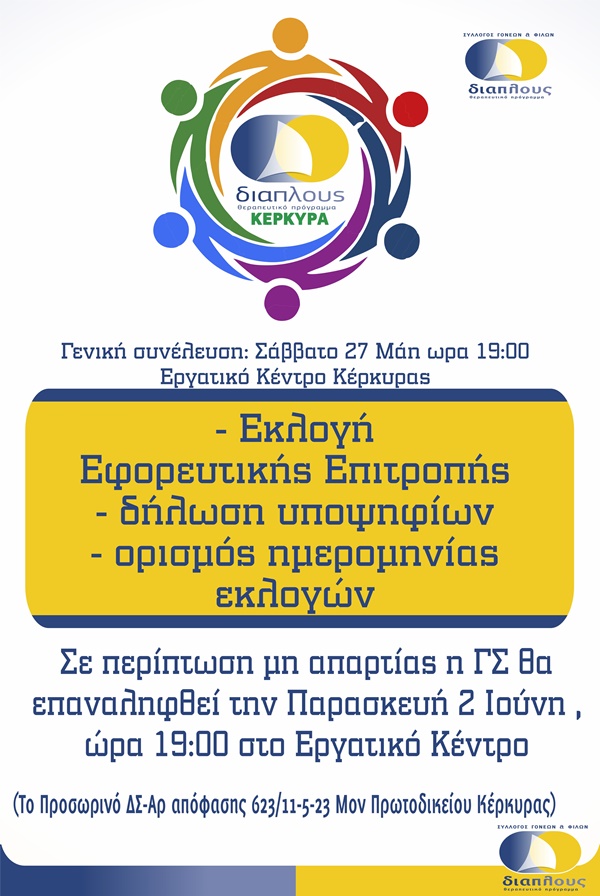 Ο Σύλλογος Γονέων και Φίλων Θεραπευτικού προγράμματος ΔΙΑΠΛΟΥΣ θα πραγματοποιήσει τη γενική συνέλευσή του στις 27 Μαΐου.