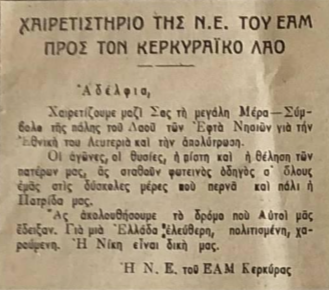 Στο μήνυμά της η Νομαρχιακή Επιτροπή του ΕΑΜ Κέρκυρας σημείωνε: