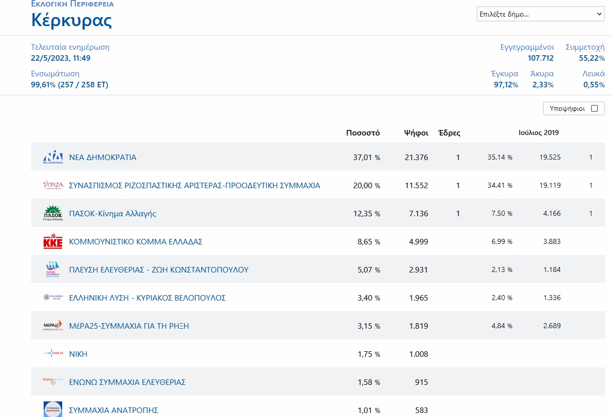 Πολύ κοντά στο πανελλαδικό αποτέλεσμα ήταν το εκλογικό αποτέλεσμα και στην Κέρκυρα, όσον αφορά τη “¨μονομαχία” των δύο πρώτων κομμάτων.