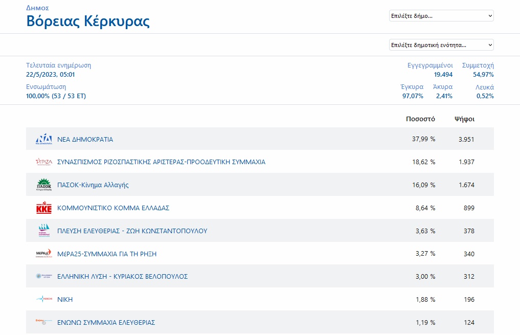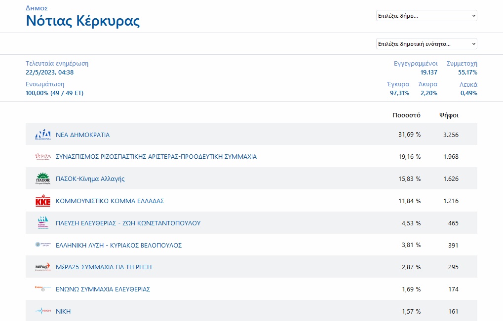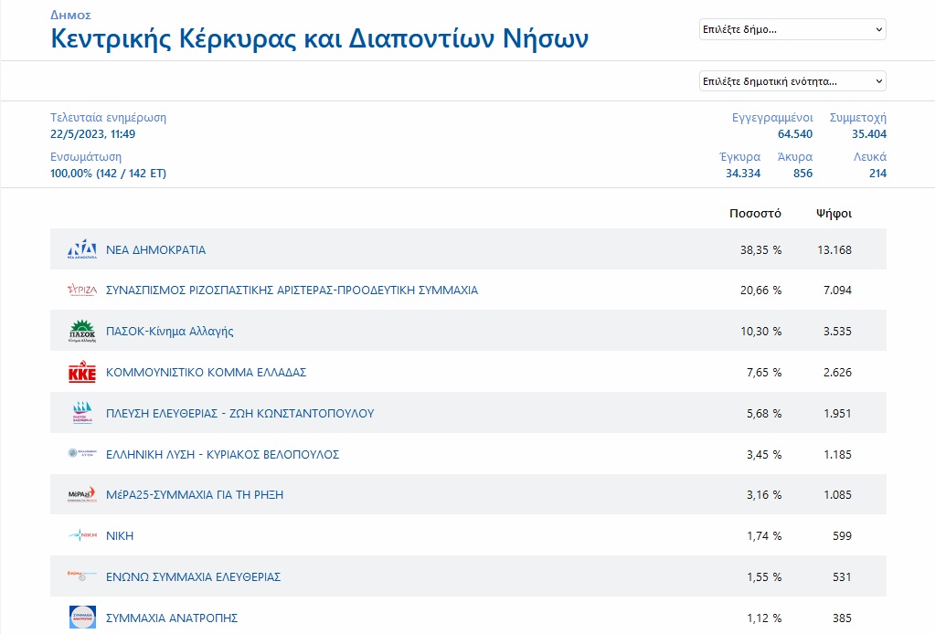 Σε όλους τους δήμους της Κέρκυρας και των Παξών η σειρά των τεσσάρων πρώτων κομμάτων ήταν ίδια με τα πανελλαδικά αποτελέσματα, ενώ, πέμπτο κόμμα παντού στην Περιφερειακή Ενότητα Κέρκυρας ήταν η Πλεύση Ελευθερίας.