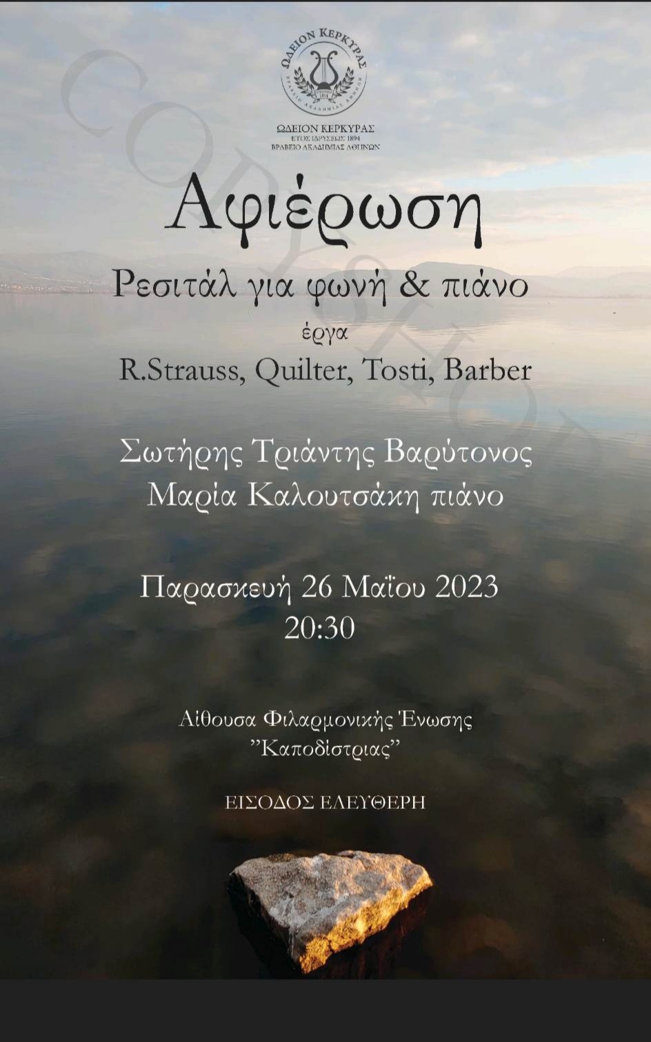 Την Παρασκευή 26 Μαΐου 2023 το Ωδείο Κέρκυρας διοργανώνει ρεσιτάλ για φωνή και πιάνο με τον βαρύτονο Σωτήρη Τριάντη και την πιανίστα Μαρία Καλουτσάκη.