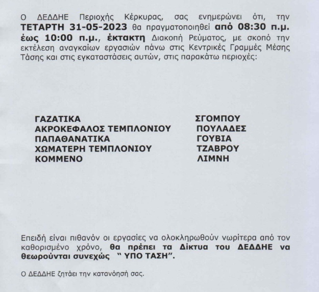 ΚΟΙΝΩΝΙΑΕΛΕΥΘΕΡΟΕΙΔΗΣΕΙΣ Έκτακτη διακοπή ρεύματος σε περιοχές της Κέρκυρας Θα πραγματοποιηθεί την Τετάρτη λόγω εργασιών στις κεντρικές γραμμές μέσης τάσης. Last updated: 30/05/2023 14:59 CorfuPress.com Published: 30/05/2023 Share SHARE Θα πραγματοποιηθεί την Τετάρτη λόγω εργασιών στις κεντρικές γραμμές μέσης τάσης. Διακοπή ρεύματος τη Δευτέρα-Δείτε που Που θα γίνει διακοπή ρεύματος την Τετάρτη Που θα γίνει διακοπή ρεύματος την Τετάρτη Που θα γίνουν προγραμματισμένες διακοπές ρεύματος το διάστημα 23-25 Αυγούστου Έρχεται διακοπή ρεύματος στη Βόρεια Κέρκυρα Share This Article Facebook Whatsapp Whatsapp Email Copy Link Print Previous Article Επίσκεψη Γκίκα στα τρία εργοτάξια των Εργατικών Κατοικιών Αγίου Ιωάννη Next Article Εγκαινιάστηκε η έκθεση για τον Κ. Θεοτόκη στο ναό του Αγ. Γεωργίου Δεν υπάρχουν Σχόλια Δεν υπάρχουν Σχόλια Αφήστε μια απάντηση Ακύρωση απάντησηςΗ ηλ. διεύθυνση σας δεν δημοσιεύεται. Τα υποχρεωτικά πεδία σημειώνονται με *Σχόλιο * Όνομα * Email * Ιστότοπος Αποθήκευσε το όνομά μου, email, και τον ιστότοπο μου σε αυτόν τον πλοηγό για την επόμενη φορά που θα σχολιάσω. ΑναζήτησηΑναζήτησηRecent PostsΌλα τα μάτια στον Θοδωρή, τον καπετάνιο μας! Τη Δευτέρα 22 Σεπτεμβρίου γιορτάζει… Σαν Σήμερα 22/9: Τα σημαντικότερα γεγονότα… Η πρόγνωση του καιρού Έφηβοι Ιονίου: Με περίπατο, συνεχίζουν στο Rising Stars! Recent CommentsΧωρίς σχόλια για εμφάνιση.