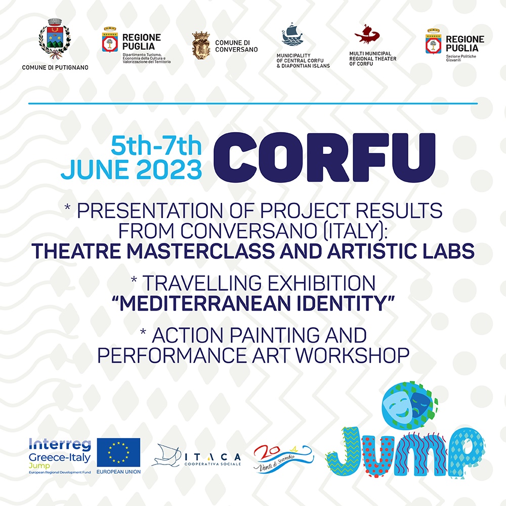 Στο πλαίσιο του προγράμματος έργου JUMP – Joint Urban Measures for Creative Players (Κοινά Αστικά Μέτρα για Δημιουργικούς Παίκτες) του Προγράμματος Interreg V/A Greece-Italy 2014-2020 με τη συγχρηματοδότηση του Ευρωπαϊκού Ταμείου Περιφερειακής Ανάπτυξης το ΔΗ.ΠΕ.ΘΕ. Κέρκυρας και η Πινακοθήκη Δήμου Κεντρικής Κέρκυρας & Δ.Ν. προσκαλούν ενήλικες που ασχολούνται με τη ζωγραφική να συμμετάσχουν στο Πειραματικό Εργαστήριο Ζωγραφικής που θα πραγματοποιηθεί υπό την καθοδήγηση του κ. Mauro Maurizio Palumbo, Καθηγητή και Λέκτορα της Ακαδημίας Καλών Τεχνών Νάπολης στον “Κήπο του Λαού” την Τρίτη 6 Ιουνίου 2023 & ώρα 16.00 έως 19.30