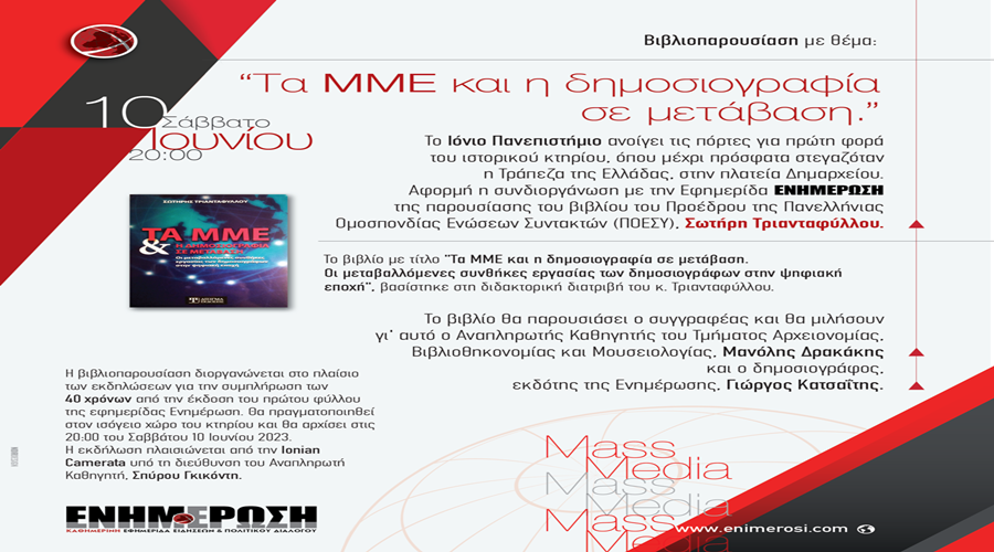 Η εφημερίδα ΕΝΗΜΕΡΩΣΗ και το Ιόνιο Πανεπιστήμιο συνδιοργανώνουν την παρουσίαση του βιβλίου του Προέδρου της ΠΟΕΣΥ, Σωτήρη Τριανταφύλλου «Τα ΜΜΕ και η δημοσιογραφία σε μετάβαση. Οι μεταβαλλόμενες συνθήκες εργασίας των δημοσιογράφων στην ψηφιακή εποχή».