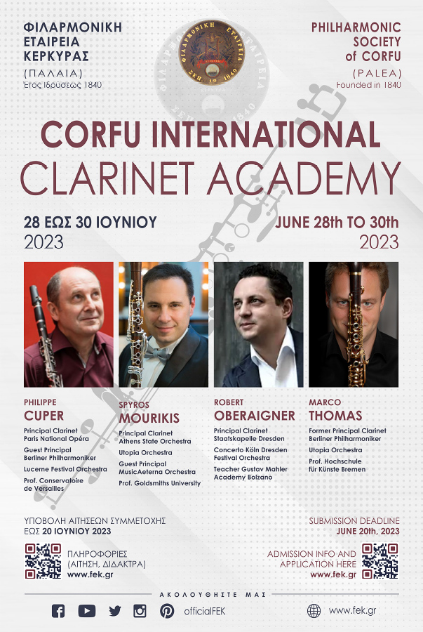Η Διεθνής Ακαδημία Κλαρινέτου Κέρκυρας θα διεξαχθεί από τις 28 έως τις 30 Ιουνίου 2023 στους χώρους της Φιλαρμονικής Εταιρείας Κερκύρας. Διδάσκουν οι καθηγητές: