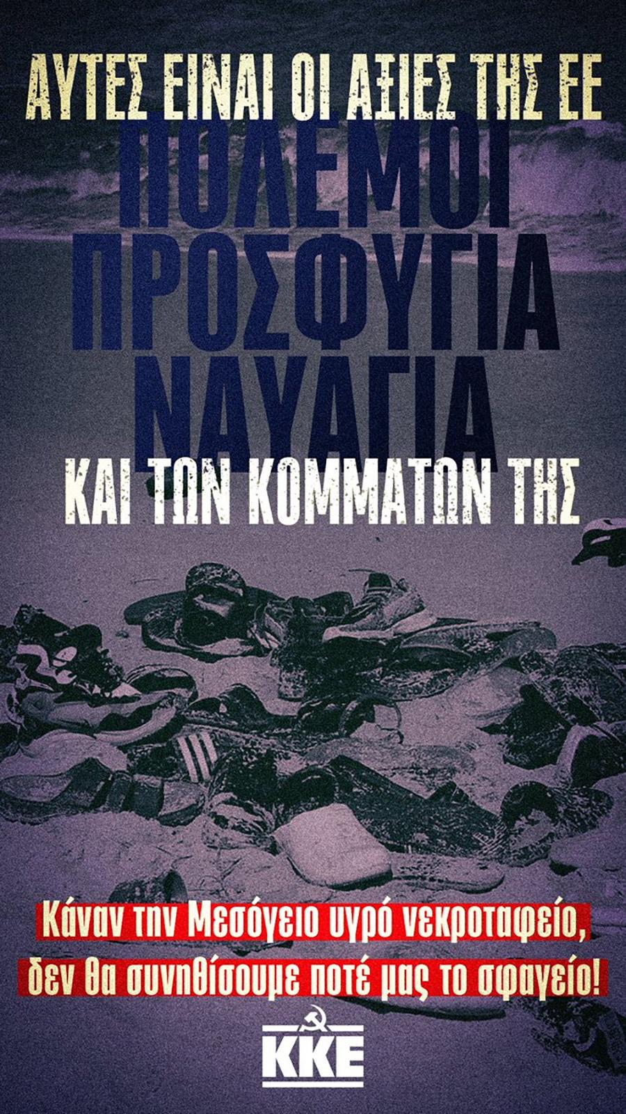 Καλούμε τον ελληνικό λαό να ορθώσει το ανάστημά του ενάντια στην “κανονικότητα” των καθημερινών ειδήσεων για νεκρούς και αγνοούμενους στον Έβρο και το Αιγαίο. Να δυναμώσει την πάλη του ενάντια στην εμπλοκή της χώρας στους ιμπεριαλιστικούς σχεδιασμούς και τον πόλεμο, που γίνονται για τα κέρδη των ιμπεριαλιστών ληστών και προκαλούν τον θάνατο και τον ξεριζωμό εκατομμυρίων ανθρώπων. Να διεκδικήσει την ουσιαστική προστασία των ξεριζωμένων και την κατάργηση όλου του άδικου πλαισίου καταστολής σε βάρος τους.