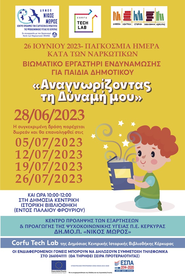 Το Κέντρο Πρόληψης των Εξαρτήσεων & Προαγωγής της Ψυχοκοινωνικής Υγείας Π.Ε Κέρκυρας ΔΗ.ΜΟ.Π «Νίκος Μώρος» σε συνεργασία με το Corfu Tech Lab της Δημόσιας Κεντρικής Ιστορικής Βιβλιοθήκης Κέρκυρας, διοργανώνουν, με αφορμή την 26η Ιουνίου, Παγκόσμια Ημέρα κατά των Ναρκωτικών, βιωματικό εργαστήρι για παιδιά Δημοτικού, με θέμα «Αναγνωρίζοντας τη Δύναμή μου», αξιοποιώντας το παραμύθι «Η δύναμή μου» της εκπαιδευτικού κ. Κωνσταντίνας Αρμενιάκου με την εικονογράφηση του κ. Νίκου Ανδρικόπουλου (εκδ. Μεταίχμιο), που ευγενικά μάς παραχώρησαν.