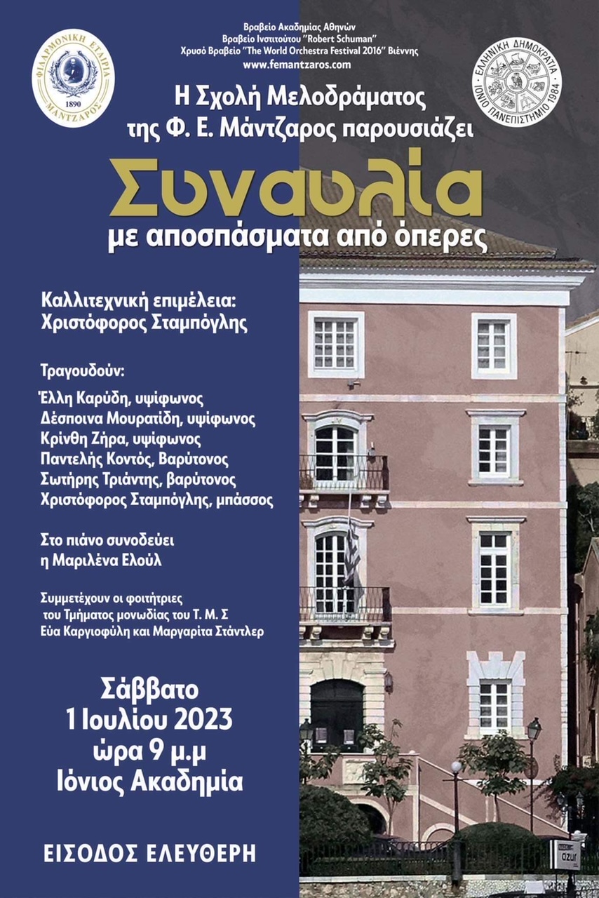 Η Σχολή Μελοδράματος της «Φιλαρμονικής Εταιρίας Μάντζαρος», θα πραγματοποιήσει συναυλία με αποσπάσματα από Όπερες, το Σάββατο 01/07/2023 και ώρα 21:00, στην επίσημη Αίθουσα της Ιονίου Ακαδημίας.
