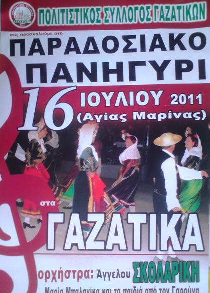 ► Παραδοσιακό πανηγύρι στα Γαζάτικα για τον εoρτασμό της Αγίας Μαρίνας θα πραγματοποιηθεί τη Δευτέρα 17 Ιουλίου 2023. Ώρα 20:00