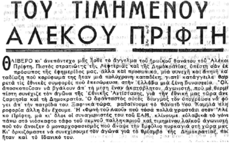 «Θλιβερό κι’ αναπάντεχο μας ήρθε το άγγελμα του ηρωικού θανάτου του Αλέκου Πρίφτη. Πιστός στρατιώτης της Λεφτεριάς και της Δημοκρατίας, υπέστη σαν εκπρόσωπος της εφημερίδας μας, αλλά και προσωπικά, μια συνεχή και απηνή καταδίωξη, που κορύφωμά της ήταν μια πολύχρονη καταδίκη, γιατί κατάγγειλε θαρρετά τις εθνικές συμφορές που επεσώρευσε στην Ελλάδα μια ξένη δυναστεία. Όλοι αποσκοπούσαν να βγάλουν απ’ τη μέση έναν ακατάβλητο αγωνιστή, που με θερμή πίστη συνέχιζε τον αγώνα της Εθνικής Αντίστασης, για την εθνική μας τώρα ανεξαρτησία και τη Δημοκρατία. Ο αφάνταστος αυτός διωγμός τον υποχρέωσε να φύγει απ’ την πατρίδα του. Ξαφνικά τώρα, μαθαίνουμε το θάνατό του. Καμμιά πληροφορία άλλη δεν έχουμε. Η “Φωνή του Λαού” που τόσα πολλά χρωστάει στον Αλέκο Πρίφτη, μα κι’ όλοι οι συναγωνιστές του τού ΕΑΜ, κλίνουμε ευλαβικά το γόνυ πάνω στο νιόσκαφτο τάφο του νεκρού παλληκαριού και τιμημένου λαϊκού αγωνιστή, που τον άνοιξεν ο μοναρχοφασισμός που άναψε την εμφύλιο πυρκαγιά στη χώρα μας. Κι’ ορκιζόμαστε να συνεχίσουμε τον αγώνα για το θρίαμβο της Δημοκρατίας, που ήταν και το ιδανικό του».