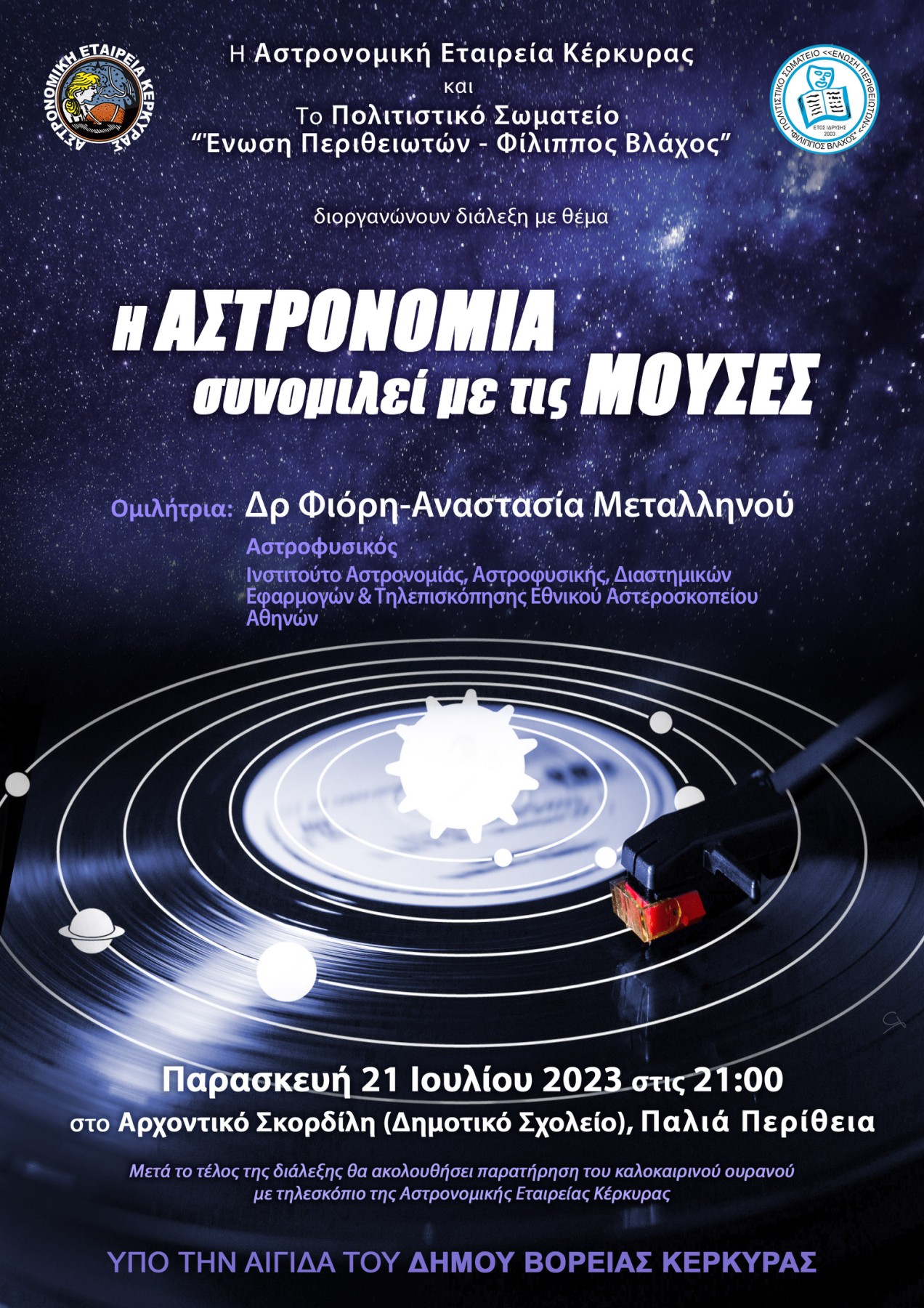 Η Αστρονομική Εταιρεία Κέρκυρας και το πολιτιστικό σωματείο “Ένωση Περιθειωτών – Φίλιππος Βλάχος”, διοργανώνουν διάλεξη με ελεύθερη είσοδο, την Παρασκευή 21 Ιουλίου 2023 στις 9,00 μ.μ. στην Παλιά Περίθεια, (Δημοτικό σχολείο) με θέμα: “Η Αστρονομία συνομιλεί με τις Μούσες”