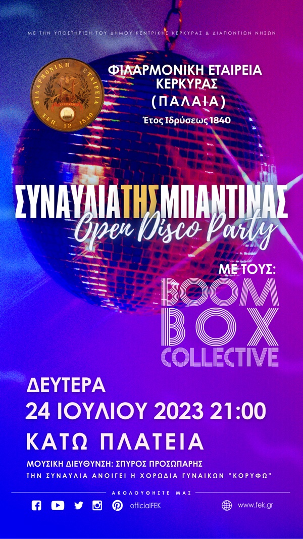Η Μπαντίνα Φιλαρμονικής Εταιρείας Κερκύρας και οι The BoomBox Collective σε pop και disco επιτυχίες των Tina Turner, Madonna, Beyoncé, Ρένας Βλαχοπούλου-Γιώργου Κατσαρού, Frank Sinatra, Michael Jackson, Abba, Queen, Village People κ.α.