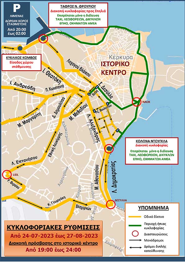 -Στο ιστορικό κέντρο της Κέρκυρας από τις 7 το απόγευμα ως τις 12 το βράδυ, από τη Δευτέρα 24 Ιουλίου έως την Κυριακή 27Αυγούστου, θα επιτρέπεται η πρόσβαση οχημάτων μόνο: