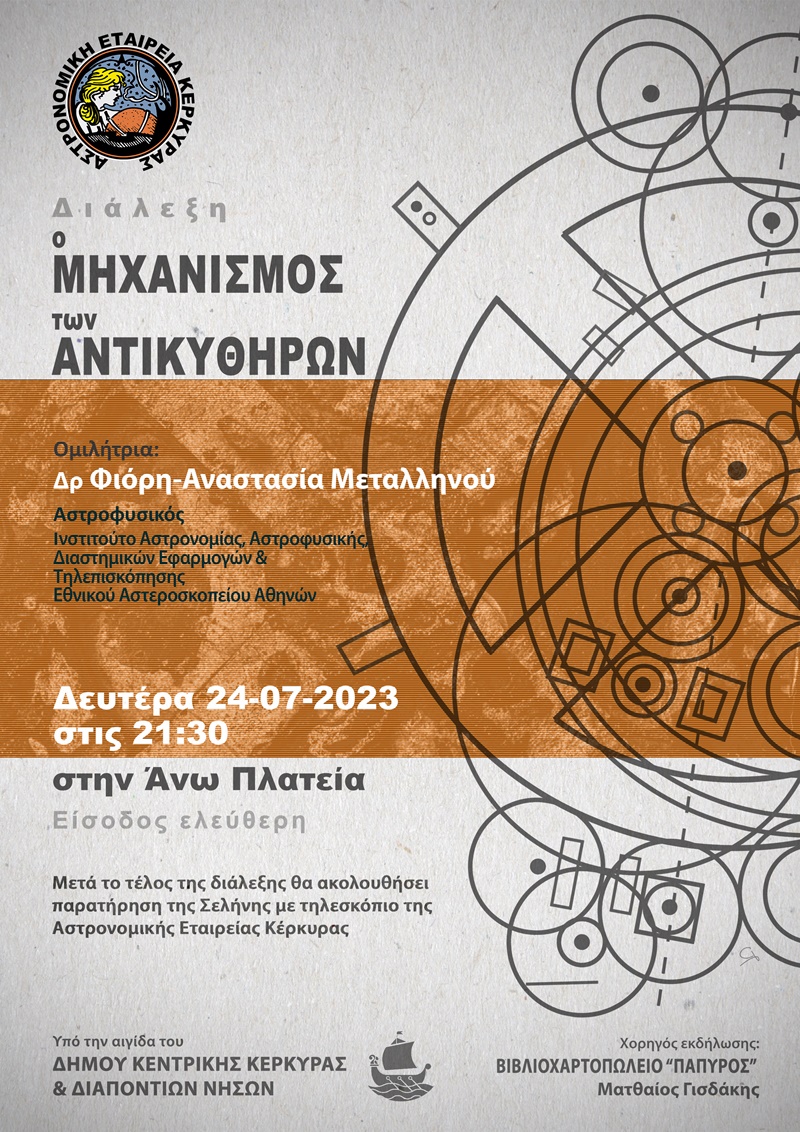 Η Αστρονομική Εταιρεία Κέρκυρας διοργανώνει διάλεξη με θέμα: Ο ΜΗΧΑΝΙΣΜΟΣ ΤΩΝ ΑΝΤΙΚΥΘΗΡΩΝ