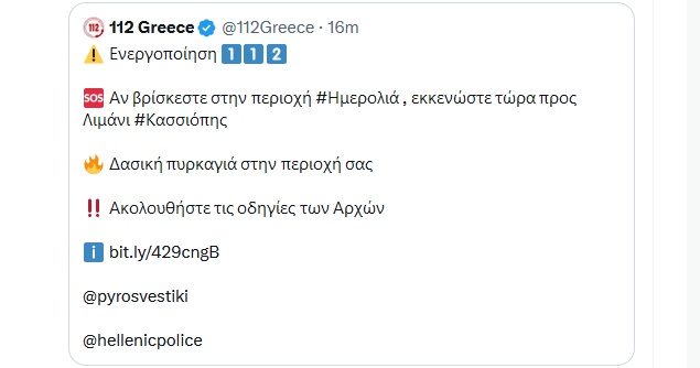 Πιο συγκεκριμένα, η νέα πυρκαγιά είναι στην Ημερολιά, με το 112 να στέλνει μήνυμα σε όσους βρίσκονται εκεί να εκκενώσουν την περιοχή και να μεταφερθούν στην Κασσιώπη.