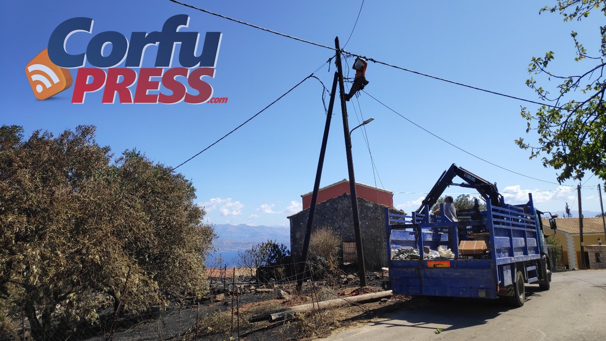 Εργολάβοι της ΔΕΔΔΗΕ έχουν απλωθεί σε όλο το κομμάτι από τις Λούτσες μέχρι την Παλιά Περίθεια αντικαθιστώντας τις καμένες ξύλινες κολόνες και περνώντας νέο δίκτυο ρεύματος, προσπαθώντας να επαναφέρουν την ηλεκτροδότηση σε όλες τις περιοχές.