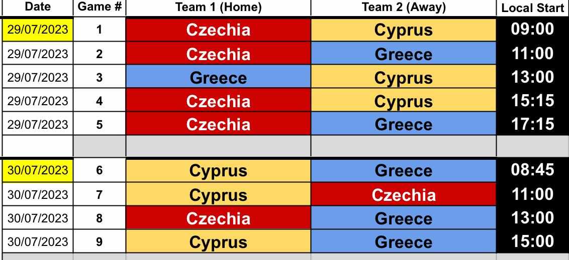 Στη διοργάνωση συμμετέχουν οι εθνικές ομάδες της Τσεχίας και της Κύπρου. Η Ελληνική αποστολή, αναχωρεί Παρασκευή 28/8 στις 14.40 με προορισμό και επιστρέφει την Δευτέρα 31/7/2023.