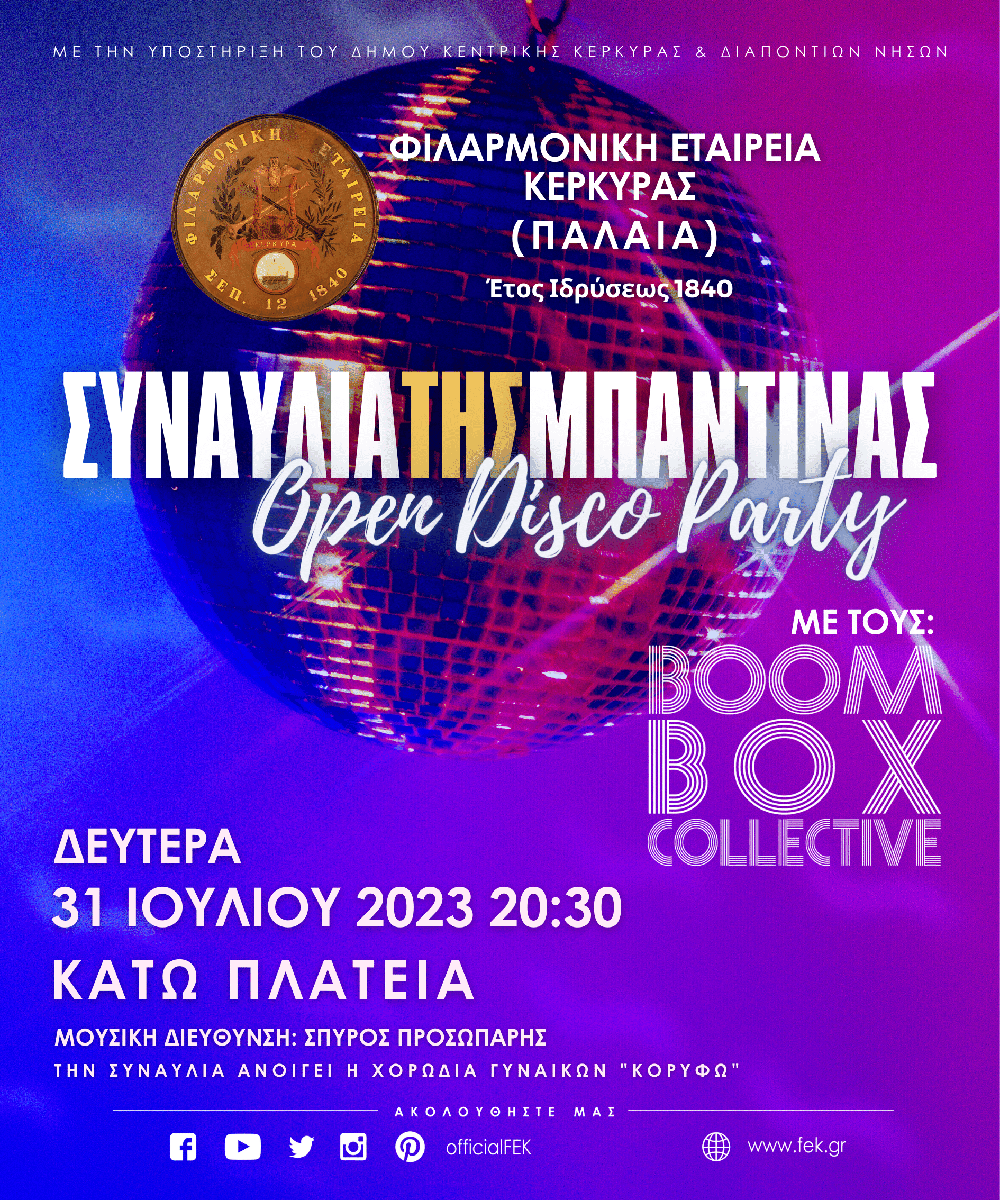 Η Μπαντίνα Φιλαρμονικής Εταιρείας Κερκύρας και οι The BoomBox Collective σε pop και disco επιτυχίες των Tina Turner, Madonna, Beyoncé, Ρένας Βλαχοπούλου-Γιώργου Κατσαρού, Frank Sinatra, Michael Jackson, Abba, Queen, Village People κ.α.