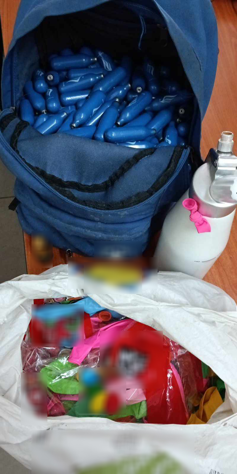 Τέλος, κατασχέθηκαν -556- αμπούλες αερίου γέλιου, -279- μπαλόνια, -1- συσκευή εκτόνωσης αμπουλών και μικροποσότητα κοκαΐνης.