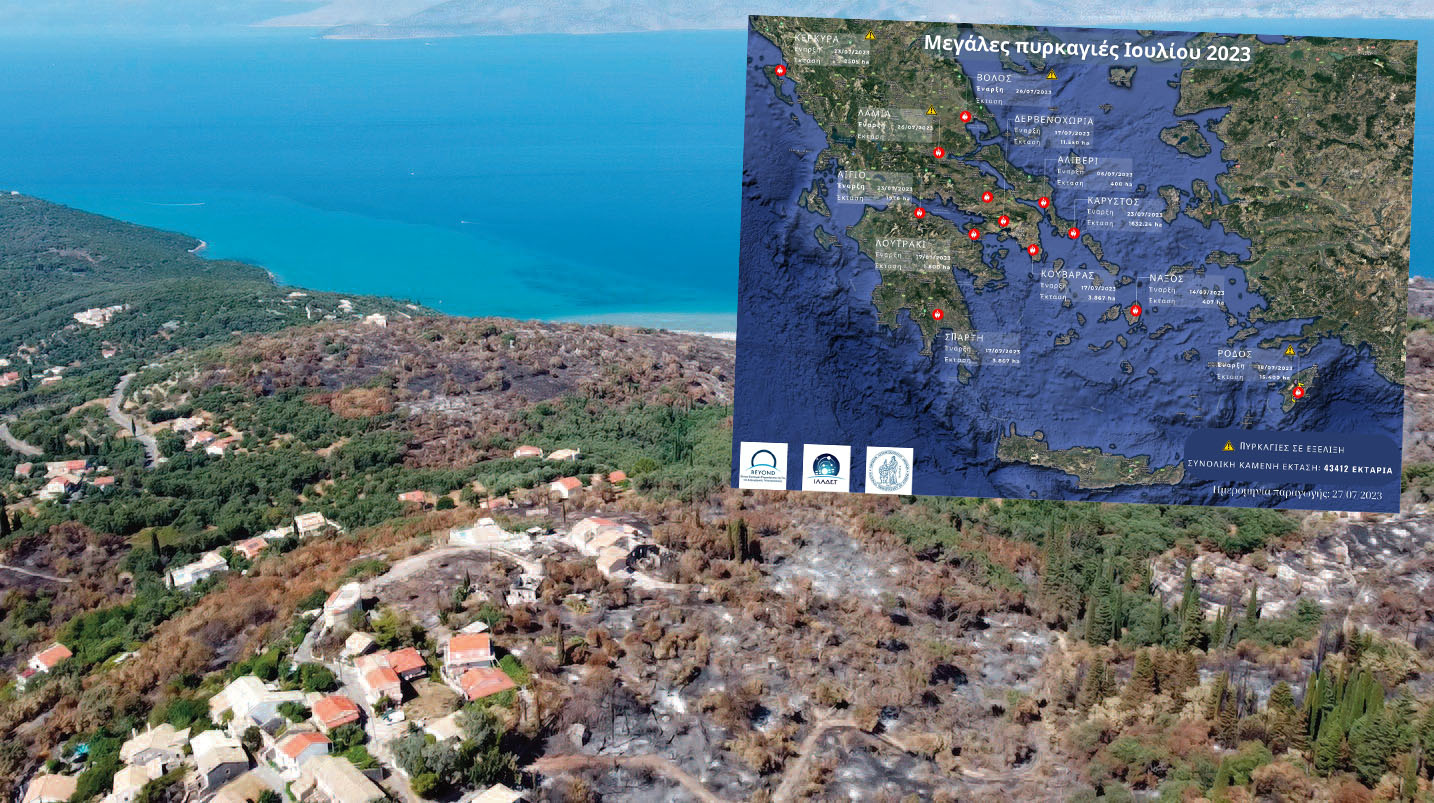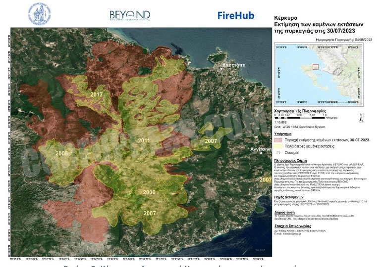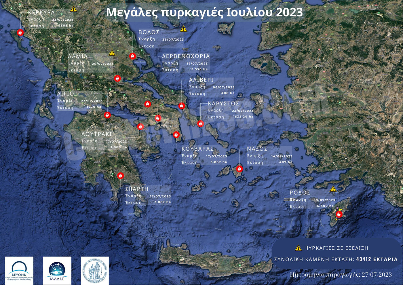 Το σύστημα BEYOND κατέγραψε λεπτομερώς τις καμένες εκτάσεις που οφείλονται στις σημαντικότερες πυρκαγιές που συνέβησαν στη χώρα μέχρι και τις 2 Αυγούστου. Με βάση τον απολογισμό εκτιμάται ότι τον Ιούλιο 2023 έχουν καεί εκτάσεις της τάξης των 507.910 στρεμμάτων, με το νησί της Κέρκυρας να μετρά 24.850 καμμένα στρέμματα.
