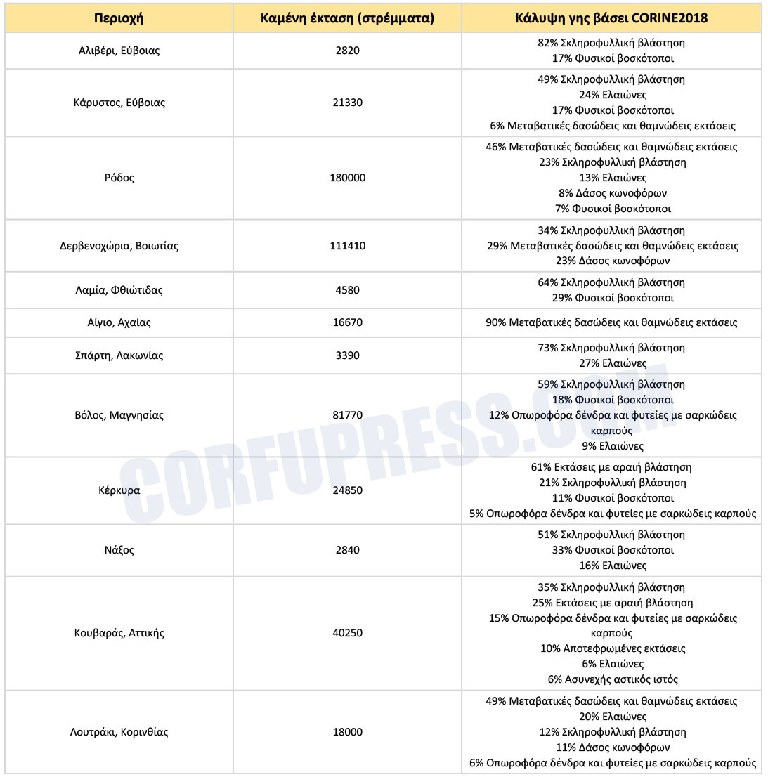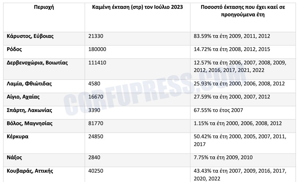 Ενδιαφέρον είναι το γεγονός ότι σύμφωνα με την Υπηρεσία Διαχρονικής Χαρτογράφησης της Επιχειρησιακής Μονάδας, οι περισσότερες από τις πυρκαγιές ξέσπασαν σε περιοχές που είχαν υποστεί παρόμοια καταστροφή στο παρελθόν. Συγκεκριμένα, στην Κέρκυρα το 50% της καμένης έκτασης είχε ξαναπληγεί τα έτη 2000, 2005, 2007, 2011, 2017 ενώ στην ευρύτερη περιοχή σημειώνονται συχνά πυρκαγιές μεγάλης έντασης.