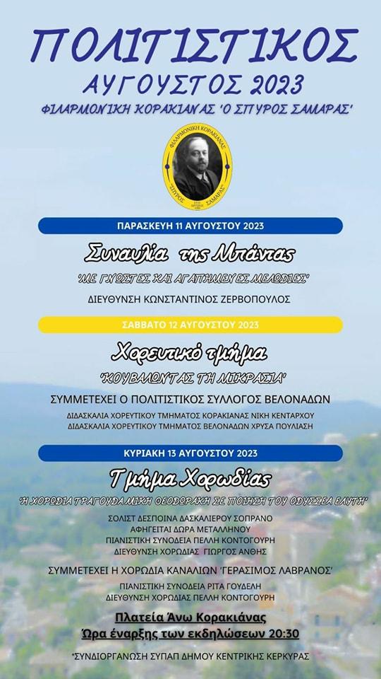 Με τίτλο “πολιτιστικός Αύγουστος”, η Φιλαρμονική Κορακιάνας “Σπύρος Σαμάρας” διοργανώνει τρεις εκδηλώσεις.