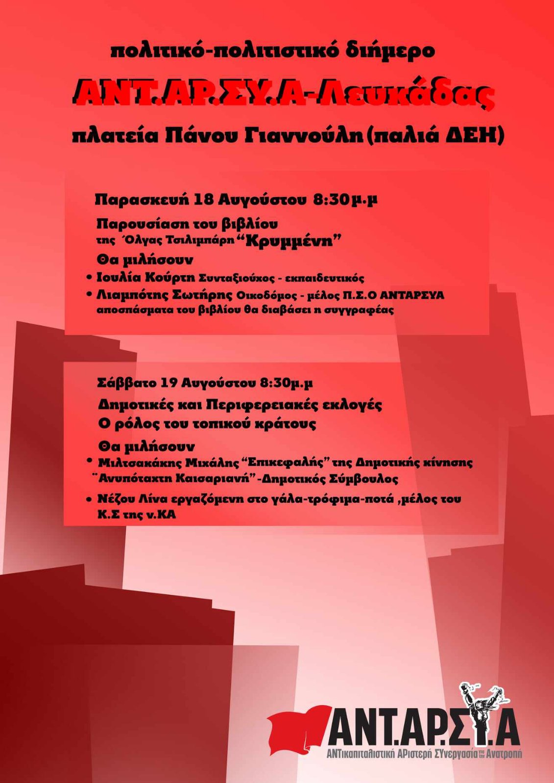 Σε μια τέτοια διερευνητική και συλλογική κινηματική θέαση της εαμικής γενιάς του ’40 και ολόκληρης της πρόσφατης ιστορίας του τόπου σάς καλεί η ΑΝΤΑΡΣΥΑ Λευκάδας, στις 18 Αυγούστου 2023, ώρα 19.30 μμ. Ως χώρο της εκδήλωσης επιλέξαμε την πλατεία Πάνου Γιαννούλη, σε ένδειξη μνήμης και τιμής στον Λευκαδίτη ανταρτοκαπετάνιο του ΕΑΜ – ΕΛΑΣ και του Δημοκρατικού Στρατού. Εκεί θα γίνει η παρουσίαση του βιβλίου μου «Κρυμμένη» και η σχετική ανοιχτή συζήτηση.