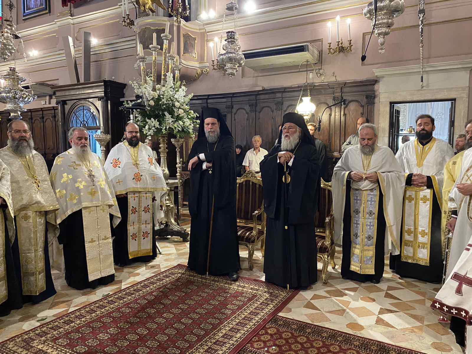 Συνεχίστηκαν το απόγευμα της Παρασκευής 11 Αυγούστου, με την τέλεση στο Ιερό Προσκύνημα του Αγίου Σπυρίδωνος Αρχιερατικού Εσπερινού, στον οποίο χοροστάτησε ο Θεοφιλέστατος Επίσκοπος Κοτυαίου κ. Διονύσιος, βοηθός επίσκοπος της Ιεράς Μητροπόλεως Ιταλίας, συγχοροστατούντων του Σεβασμιωτάτου Μητροπολίτη Νέας Ιωνίας και Φιλαδελφείας κ. Γαβριήλ και του οικείου ποιμενάρχου Σεβασμιωτάτου Μητροπολίτη Κερκύρας, Παξών και Διαποντίων Νήσων κ. Νεκταίου. Πλήθος κόσμου συμμετείχε στην ακολουθία, ενώ συνεχίζεται όλη την ημέρα και την νύκτα το προσκύνημα, καθώς ο άγιος βρίσκεται στην “θύρα”.