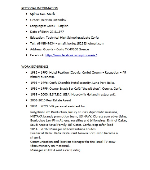 Απασχολείται αποκλειστικά στον ιδιωτικό τομέα και έχει διατελέσει επί 22 χρόνια βοηθός υψηλών προσώπων που κάνουν διακοπές στη Κέρκυρα.