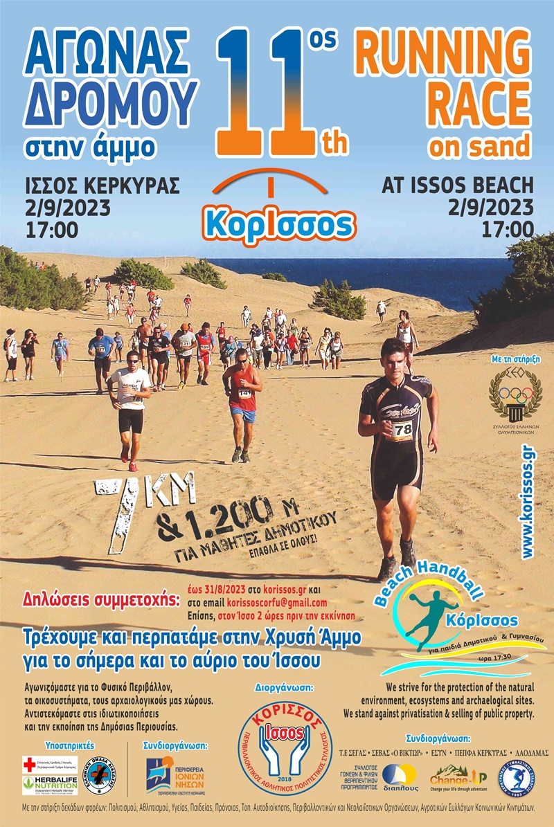 Όλα έτοιμα για το Σάββατο 2 Σεπτέμβρη (17:00 στον Ίσσο) για την διεξαγωγή του «11ου ΚόρΙσσου αγώνα δρόμου στην άμμο» 7 Km για ενήλικες και 1200μ για μαθητές δημοτικού σχολείου . Πρόκειται για μια εκδήλωση που οργανώνεται ανελλιπώς από το 2013 με πρωτεργάτες άτομα και φορείς του πολιτισμού, του αθλητισμού, της υγείας, της παιδείας , εργατικά σωματεία και κάτω από την «πρωτοβουλία ΙσSOS» η οποία μετεξελίχθηκε σε νομικό πρόσωπο, τον Κόρισσο Περιβαλλοντικό Αθλητικό και Πολιτιστικό Σύλλογο.