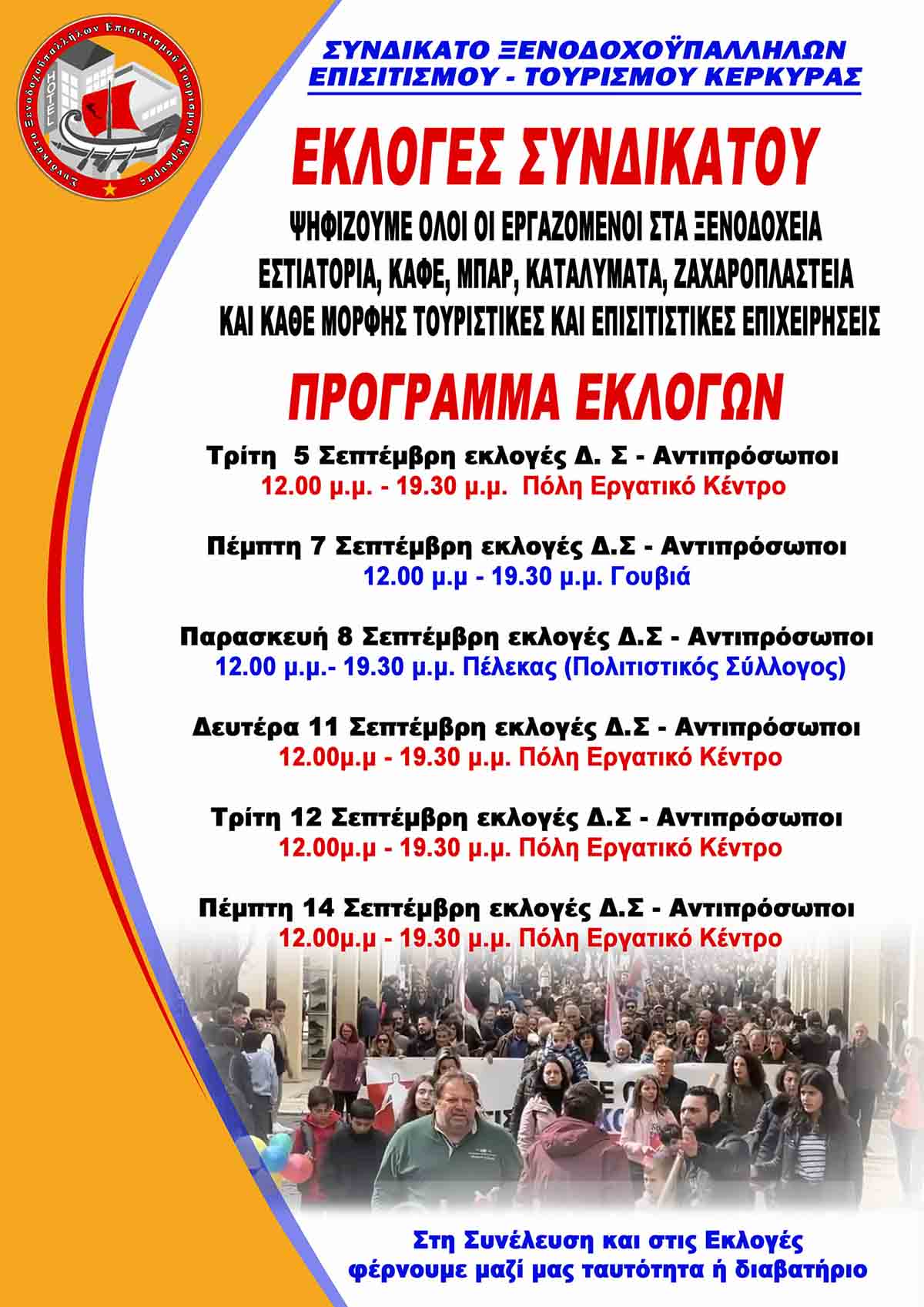 Να προσέλθουν στις κάλπες καλεί τα μέλη του Συνδικάτου Ξενοδοχοϋπαλλήλων Κέρκυρας ο πρόεδρός του Σταμάτης Πελάης, με τη διαδικασία να ξεκινά αύριο στο Εργατικό Κέντρο και να συνεχίζεται έως και τις 14 Σεπτεμβρίου.