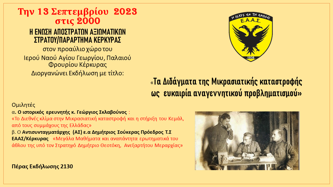 Ομιλία-Συζήτηση στον Προαύλιο Χώρο Ιερού Ναού Αγίου Γεωργίου Παλαιού Φρουρίου Κέρκυρας με τίτλο : «Τα Διδάγματα της Μικρασιατικής Καταστροφής ως ευκαιρία αναγεννητικού προβληματισμού»