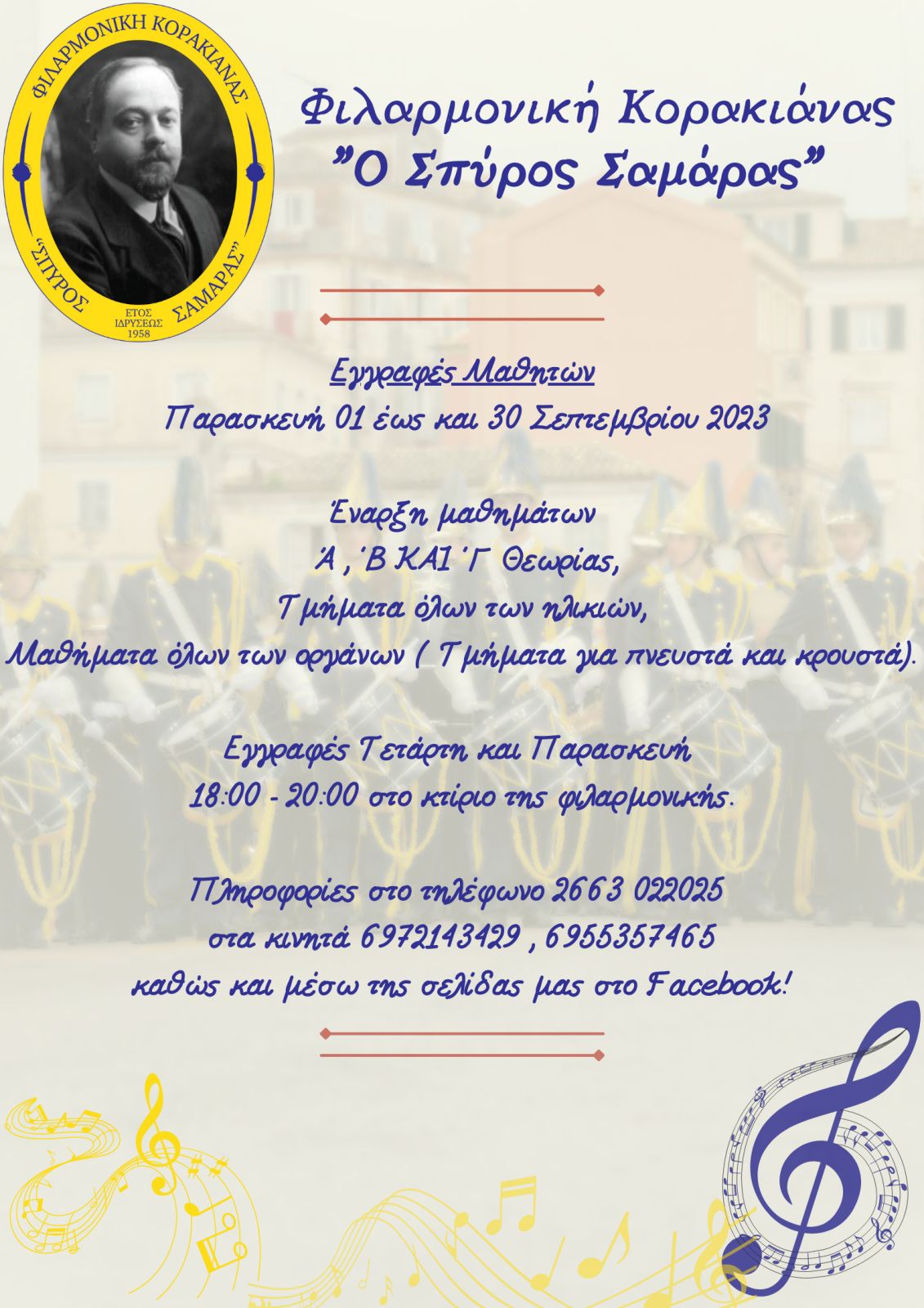 Η Φιλαρμονική “Σπύρος Σαμάρας” με ιδιαίτερη χαρά ανακοινώνει την έναρξη των εγγραφών στις Σχολές της για το σχολικό έτος 2023-2024 από την 1η μέχρι και τις 30 Σεπτεμβρίου 2023.