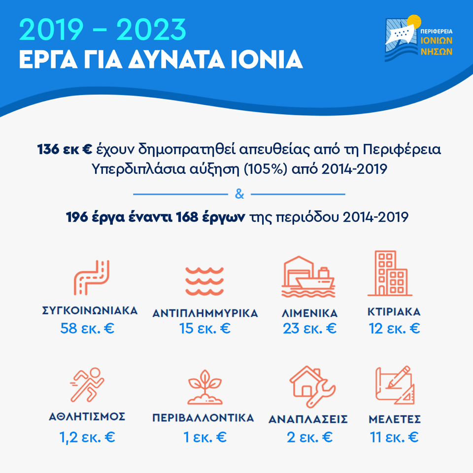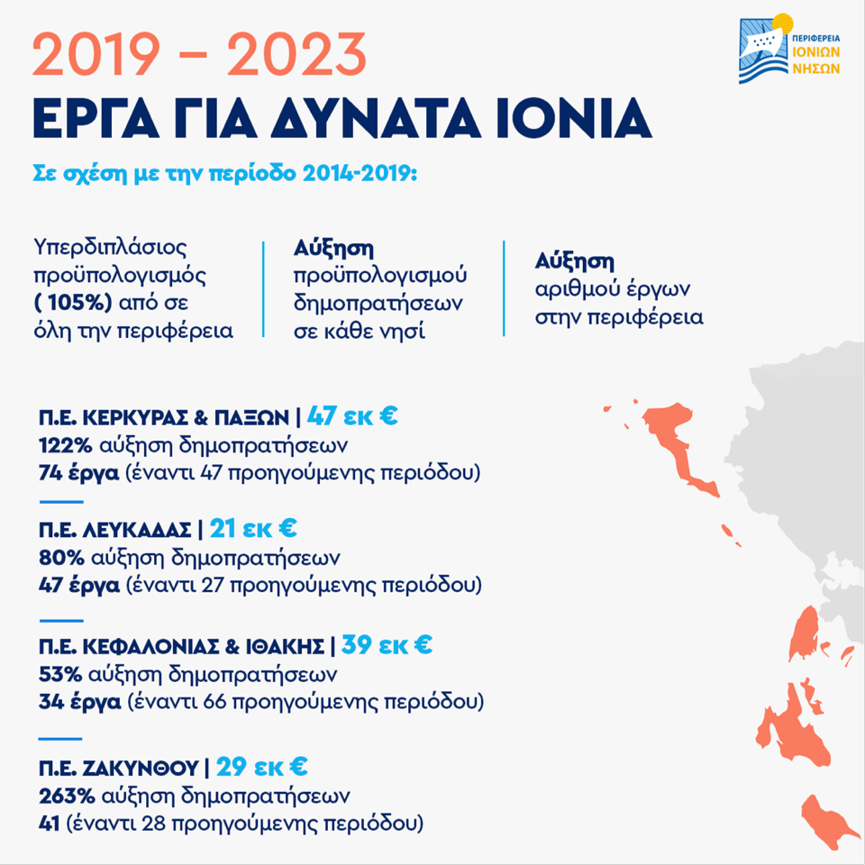 Όπως φαίνεται και στα σχετικά infographics, η Περιφέρεια Ιονίων Νήσων προχώρησε κατά την τετραετία 2019-2023 σε δημοπρατήσεις 196 έργων με τον συνολικό προϋπολογισμό να ανέρχεται στα 136.000.000 €.