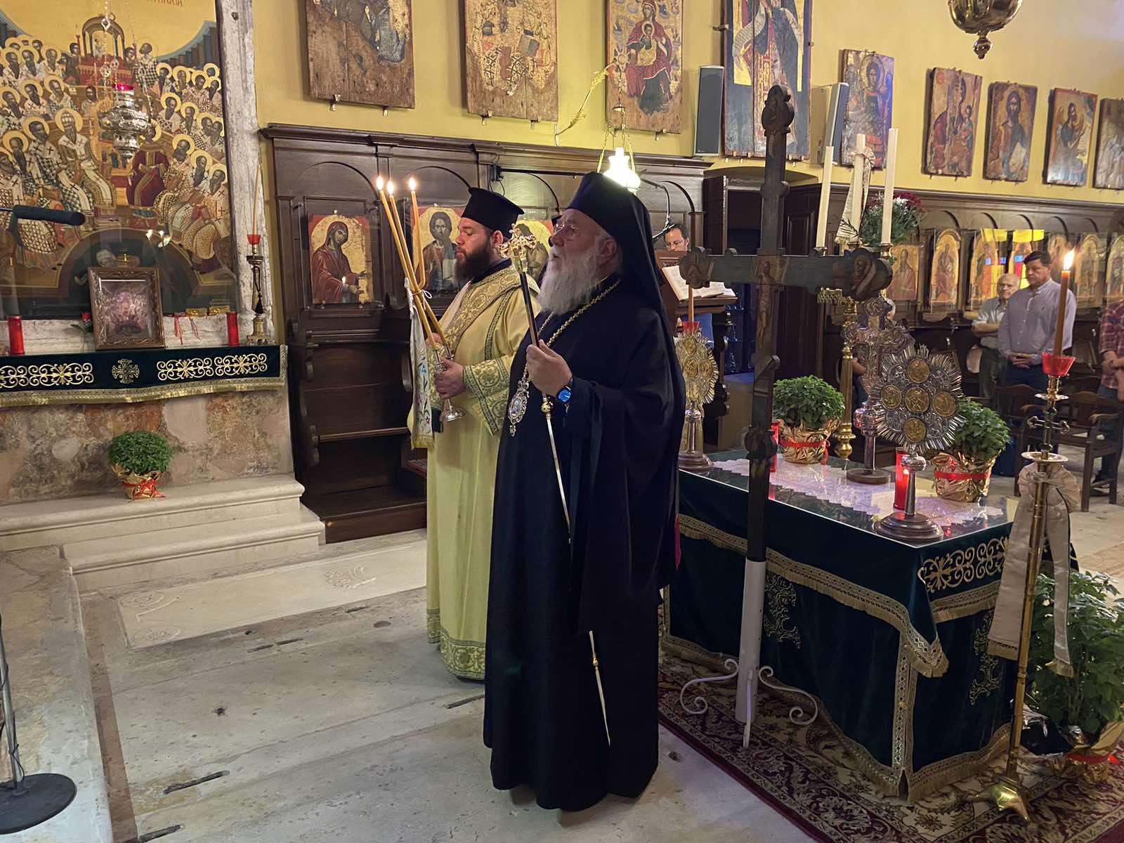 Στο τέλος της Θείας Λειτουργίας ο Μητροπολίτης τέλεσε την Ύψωση του Τιμίου Σταυρού προσφέροντας προς ασπασμό στους πιστούς. το Τίμιο Ξύλο και την ευλογία του βασιλικού.