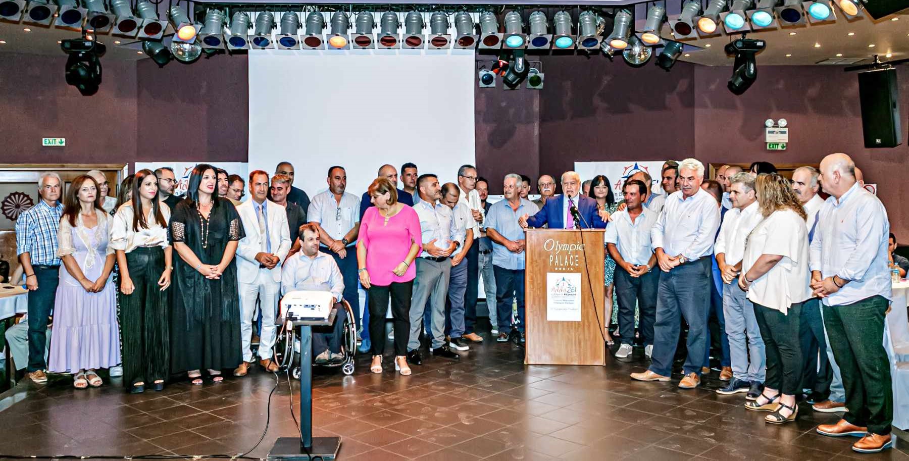 «Είμαι ιδιαίτερα συγκινημένος που βρίσκομαι μαζί σας και νιώθω βαθιά ευγνώμων για την εμπιστοσύνη σας. Είναι μεγάλη τιμή για μένα να παρευρίσκονται εδώ απόψε όλοι εκείνοι οι εκλεκτοί αξιόμαχοι από τις 38 μας κοινότητες και τους οικισμούς για μια κοινή πορεία με στόχο να πάμε το Δήμο μας ψηλότερα».