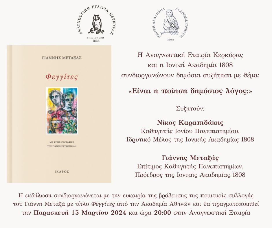 Η εκδήλωση συνδιοργανώνεται με την ευκαιρία της βράβευσης της ποιητικής συλλογής του Γιάννη Μεταξά με τίτλο Φεγγίτες από την Ακαδημία Αθηνών και θα πραγματοποιηθεί την Παρασκευή 15 Μαρτίου 2024 και ώρα 20:00 στην Αναγνωστική Εταιρία.