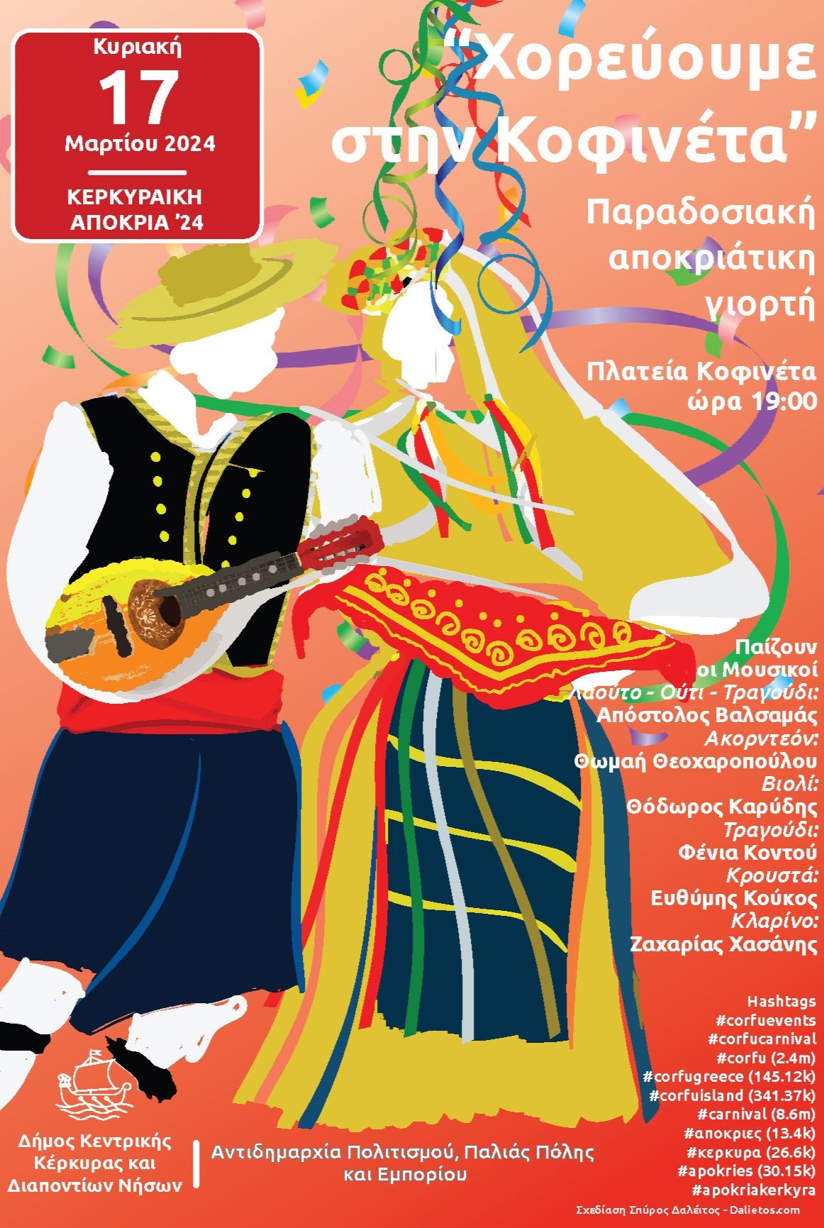 O Δήμος Κεντρικής Κέρκυρας και Διαποντίων Νήσων σας προσκαλεί στην παραδοσιακή Αποκριάτικη Γιορτή που θα πραγματοποιηθεί στην Κοφινέτα, την Κυριακή της Τυρινής 17 Μαρτίου 2024 και ώρα 19:00 με τη λήξη των αποκριάτικων εκδηλώσεων του Δήμου μας.