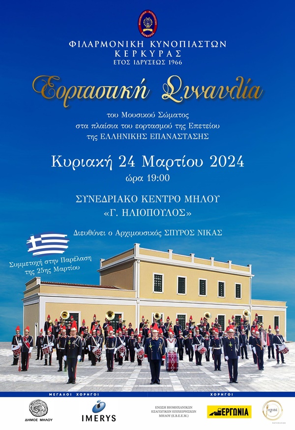 Την Κυριακή 24 Μαρτίου θα πραγματοποιήσει Εορταστική Συναυλία στο Συνεδριακό Κέντρο Μήλου “Γ. Ηλιόπουλος” και τη Δευτέρα 25η Μαρτίου θα λάβει μέρος στην καθιερωμένη παρέλαση .