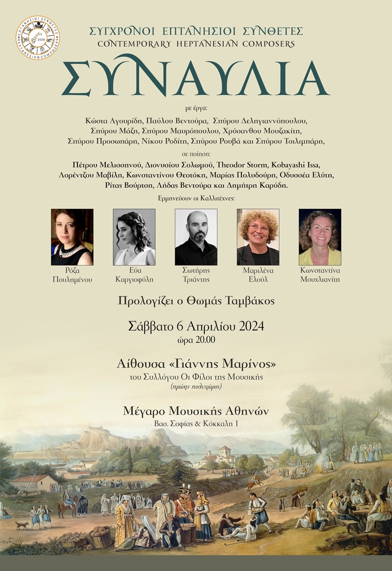 Η ομάδα των Σύγχρονων Επτανήσιων Συνθετών διοργανώνει συναυλία μελοποιημένης ποίησης με έργα Κώστα Αγουρίδη, Παύλου Βεντούρα, Σπύρου Δεληγιαννόπουλου, Σπύρου Μάζη, Σπύρου Μαυρόπουλου, Χρύσανθου Μουζακίτη, Σπύρου Προσωπάρη, Νίκου Ροδίτη, Σπύρου Ρουβά και Σπύρου Τσιλιμπάρη, σε ποίηση Πέτρου Μελισσηνού, Διονυσίου Σολωμού, Theodor Storm, Kobayashi Issa, Λορέντζου Μαβίλη, Κωνσταντίνου Θεοτόκη, Μαρίας Πολυδούρη, Οδυσσέα Ελύτη, Ρίτας Βούρτση, Λήδας Βεντούρα και Δημήτρη Καρύδη.